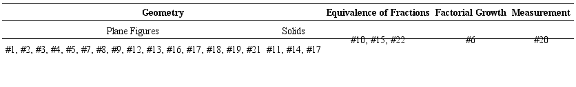In most of the DMP (#1–9, #11–14, #16–19, and #21) students explored ideas about Geometry, in specific, properties and/or examples of plane figures (e.g. polygons and circles) and solids. In DMP #10, #15, and #22 students explored equivalence of fractions, but also made connections to geometric representations. Only in DMP #6 students explored factorial growth and in DMP #20 they explored measurement. Among those DMP in which students explored Geometry, in DMP #1–5, #7–9, #12, #13, #16, #18, #19, and #21 students explored plane figures (mainly polygons). In DMP #11, #14, and #17 students explored solids, in particular, in DMP #17, they explored solids and some aspects of the plane figures that form the solids (faces). In Table 2, I present the math contents/ideas explored in each DMP.