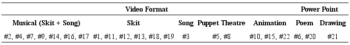 Students used a variety of materials (e.g. costumes, posters, scenarios, modeling clay, papers to represent shapes, and so forth) in their musicals, skits, songs, puppet theatre, and animation performances. These materials are very significant for students' and the audience's meaning production. In DMP #1, #4, #5, #8, #10, #15, and #22 students used manipulative materials. In DMP #1, students used paper materials to create representations of polygons and non-polygons, which are part of the puzzle posed. In DMP #4, students also use paper material to construct representations of triangles to build representations of several figures (e.g. parallelogram and hexagon). In DMP #5 and #8 students also used papers and sticks to create the puppet characters that are representations of geometric figures. In DMP #10, #15, and #22 students used paper materials and modeling clay to produce their animations using the stop-motion animation that reveals a visual proof for equivalence of fractions.