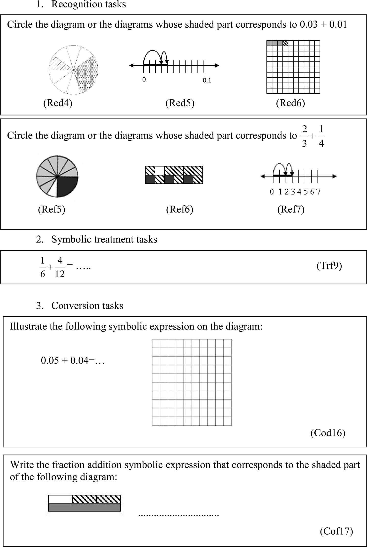 The test included: (a) 17 representational flexibility tasks in fraction addition and (b) 19 representational flexibility in decimal number addition. Representational flexibility tasks differed in terms of the following three aspects: (a) the transformations of representations, b) the types of representation and c) the rational number concept. With respect to the transformations, there were three types of tasks: recognition (Type Re tasks), treatment (Type Tr tasks) and conversion (Type Co tasks) tasks. Concerning the types of representation, both diagrammatic and symbolic representations were involved. The diagrammatic representations that were used are the rectangular area, the circular area and the number line. We concentrated on circular and linear model since they are the two types of geometric shapes that are used to introduce the continuous model of fractions (BOULET, 1998). The part-whole whole subcontract of rational numbers is used, which is consider fundamental for developing understanding of fractions as ratio, operator, quotient and measure (LAMON, 2001). The measure subcontract that is involved in tasks of number line is regarded as helpful for reaching additive operations with rational numbers (CHARALAMBOUS; PITTA-PANTAZI, 2007).