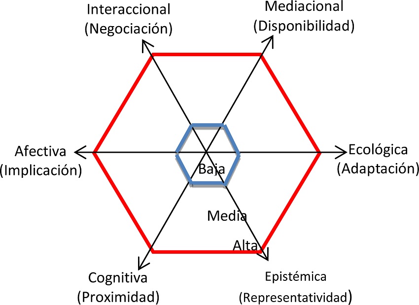 Si bien la Facultad de Ciencia y Tecnología a la que está adscrita la Licenciatura en Matemáticas establece lineamientos generales, es claro que el proceso de instrucción analizado no sigue las directrices curriculares. Una presentación del cálculo integral basada en la sola ejecución de las reglas de transformación de términos a través de ejemplos desarticulados impide que se incorporen relaciones con otros contenidos intra e interdisciplinares. Además, suele fomentar en los alumnos una concepción de las matemáticas como algo perfecto y acabado que consiste en memorizar y aplicar un conjunto de reglas. En síntesis, el proceso de instrucción es de baja idoneidad ecológica. En el siguiente diagrama (Figura 1) suponemos el hexágono regular exterior como la idealización de la idoneidad didáctica de un proceso de instrucción de buena calidad (se consiguen de manera conjunta todas las idoneidades), mientras que el hexágono interno refleja la idoneidad de la clase observada.