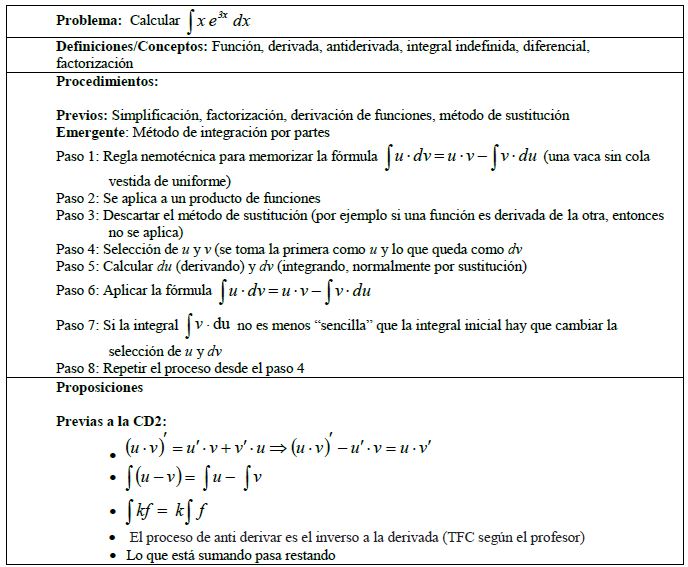 Durante esta secuencia de las 12 sesiones de clase, el profesor pretende enseñar el método de integración por partes. Los alumnos, sobre todo, realizan la práctica de resolver integrales por este método de integración. En particular, esta es la práctica que se realiza en CD2. Si consideramos los aspectos del conocimiento para la realización y evaluación de la práctica que permiten resolver una situación problema – por ejemplo, calcular una integral – vemos el uso de lenguajes verbales y simbólicos. Estos lenguajes son la parte ostensiva de una serie de conceptos, proposiciones y procedimientos que intervienen en la elaboración de argumentos para decidir si las acciones realizadas son satisfactorias. Así, cuando un agente lleva a cabo y evalúa una práctica matemática, activa un conglomerado formado por situaciones problema, lenguajes, conceptos, proposiciones, procedimientos y argumentos. Para la CD2, que es el episodio que analizamos con detalle, dichos elementos se articulan en la siguiente configuración epistémica1 (Cuadro 1).