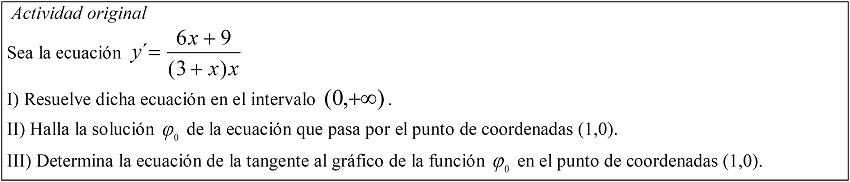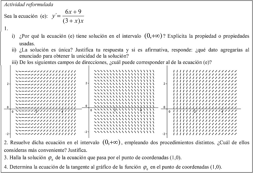 Este equipo de profesores considera para su reformulación una clase de Análisis I, curso del segundo año de la formación inicial de profesores de matemática. La misma aborda conceptos que ya habían sido trabajados previamente como son el de primitiva, función integral y los métodos de integración, en particular el de descomposición en fracciones simples. Para ello proponen la resolución de una ecuación diferencial (Cuadro 1):