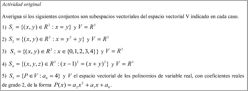Estos profesores consideran para reformular, una clase del curso Geometría y Álgebra Lineal, del segundo año de la formación inicial de profesores de matemática, en la que se pretende abordar la condición necesaria y suficiente para que un conjunto sea un subespacio de un espacio vectorial. En clases anteriores se había trabajado con los conceptos de espacio y subespacio vectorial y analizaron junto a los alumnos cuáles son los subespacios de R2 y de R3. A partir de este análisis, en la clase propuesta originalmente se planteó la condición, enunciando el respectivo teorema y demostrándolo junto a los alumnos. A continuación de la demostración del teorema se propuso el siguiente ejercicio (Cuadro 3):