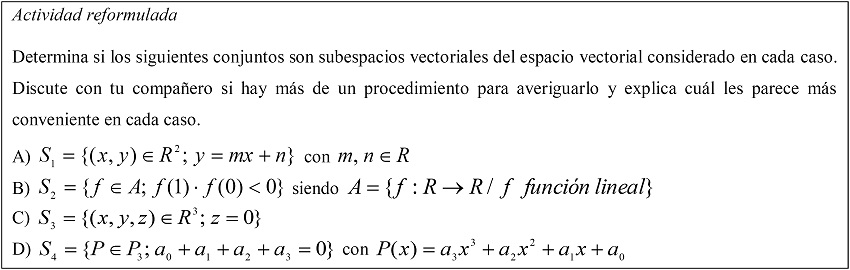 Lo que resulta más interesante de la propuesta y que da cuenta de la apropiación del marco teórico como elemento que da dirección a las decisiones didácticas, lo constituye la situación final de reinversión, propuesta después del enunciado y demostración de la condición necesaria y suficiente para que un conjunto sea un subespacio de un espacio vectorial (Cuadro 4):