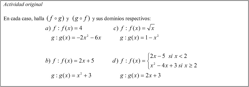 La clase a reformular corresponde a la asignatura Cálculo de la carrera de Ingeniería Audiovisual de una universidad privada. La clase tuvo por objetivo que el estudiante fuera capaz de determinar el dominio de una función compuesta. Se planteó la siguiente actividad (Cuadro 5):