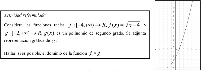 En el caso de las docentes que trabajaron con un problema que requería hallar el dominio de una función compuesta, la intervención en la propuesta consistió en cambiar el registro de representación de una de las funciones dadas como dato inicial: de algebraico a gráfico. Esa modificación invita a los estudiantes a pensar alternativas de resolución diferentes a las manejadas en tareas tradicionales, conduciéndolos a una inspección de los símbolos para evitar cálculos innecesarios (como podría ser el hallar la expresión analítica de la función a partir de su representación gráfica).