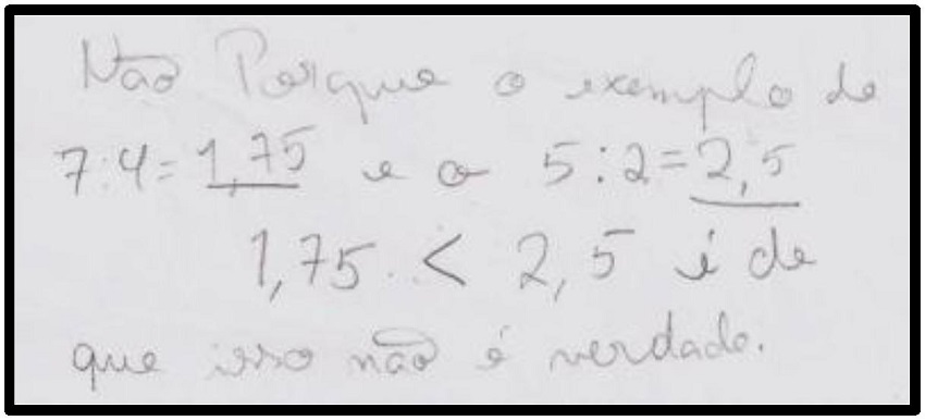 Um outro tema trabalhado no estudo de aula, em especial a partir da sessão 4, foram os processos de raciocínio, analisados a partir de exemplos de resoluções de alunos. A equipe formadora começou por fazer uma breve apresentação dos conceitos de generalização e justificação, dos quais as professoras se apropriaram com facilidade. Ao observar as resoluções dos alunos, Tânia e Inês identificaram facilmente generalizações e justificações. Assim, no caso da Figura 2, Tânia reconheceu que o aluno usou um contraexemplo para refutar uma afirmação e, por isso, estava a fazer uma justificação: “é mais uma justificação, ele vai arranjar um exemplo” (Tânia, Gravação de áudio da Sessão 4, 2013).