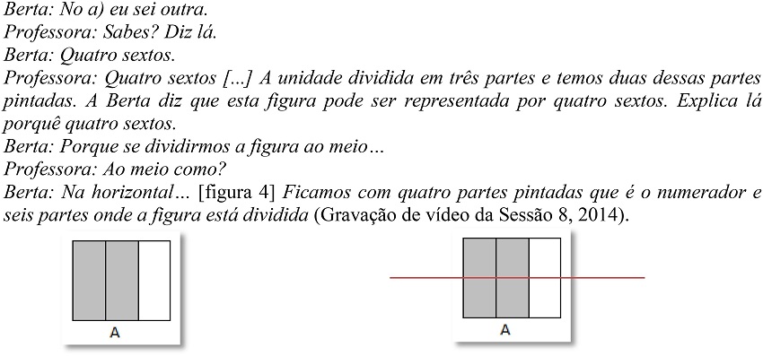 Professora: Quatro sextos […] A unidade dividida em três partes e temos duas dessas partes pintadas. A Berta diz que esta figura pode ser representada por quatro sextos. Explica lá porquê quatro sextos.