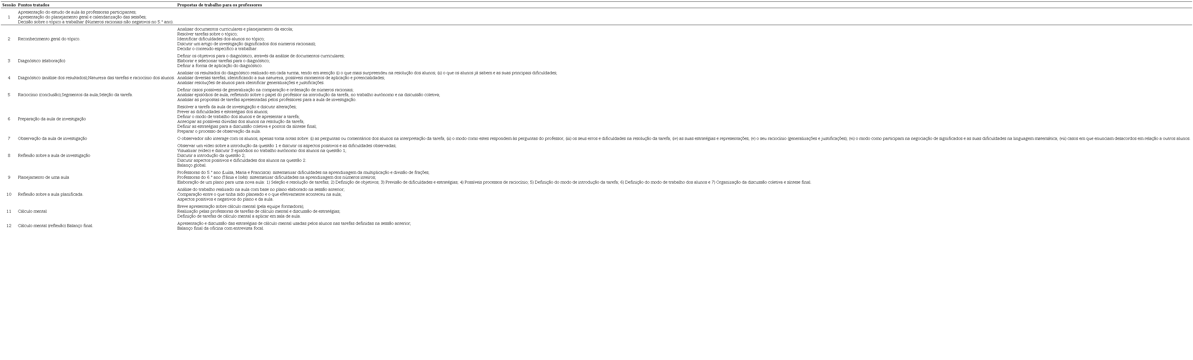 As sessões tiveram uma periodicidade aproximadamente quinzenal, seguindo o plano geral mostrado no Anexo 1. A sessão 1 serviu para apresentar o estudo de aula às professoras e programar o trabalho, as sessões 2 a 6 foram destinadas a aprofundar o seu conhecimento sobre um tópico e preparar uma aula sobre esse tópico, a sessão 7 consistiu na observação da aula e a sessão 8 foi dedicada a refletir sobre essa aula. Com base no trabalho anterior, nas sessões 9 a 12 as professoras planificaram e refletiram sobre duas aulas. Na sessão 12 fez-se ainda o balanço final de todo o trabalho em entrevista focal. Os dados aqui analisados foram recolhidos por observação participante com elaboração de um diário de bordo (por um membro da equipe), gravação de áudio das sessões e de vídeo da aula de investigação, sendo sempre feitas as transcrições integrais.