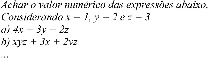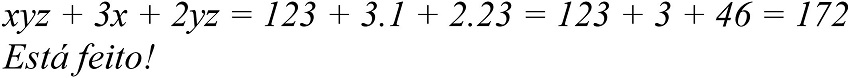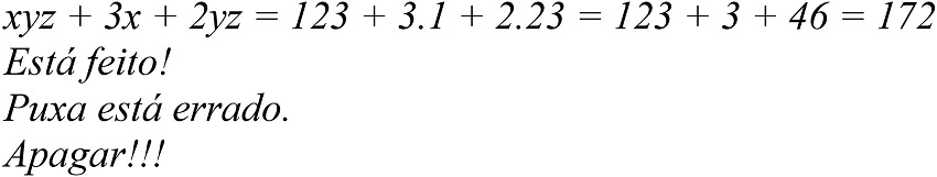 O professor corrige e explica novamente: quando temos duas ou mais incógnitas juntas, significa que elas estão sendo multiplicadas uma pela outra. Veja por exemplo: xyz significa x vezes y vezes z. Entendeu? Quando tem um número antes da letra é a mesma coisa: 3x é igual a três vezes x. É assim que se opera em matemática, tá vendo? É só fazer sempre assim…