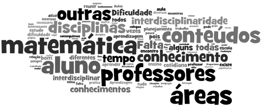 A figura 1 1 ilustra, de maneira ampla, as percepções dos professores participantes do presente estudo sobre um ensino interdisciplinar. De acordo com a nuvem de palavras, a palavra Matemática é evidentementemente a mais citada pelos professores. Acredita-se que esta evidência esteja relacionada com a formação inicial dos mesmos e por ser a disciplina que ministram na escola, pois em momento algum foi solicitado que as declarações deveriam ser apontadas especificamente para o ensino de Matemática, a interdisciplinaridade foi solicitada em uma perspectiva globalizada no contexto escolar.