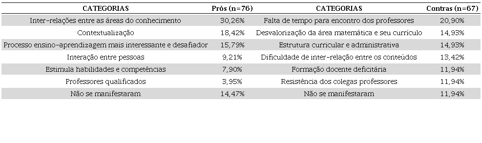 Com auxílio da análise textual discursiva, conforme Moraes (2003), foram elaboradas seis categorias para os aspectos positivos e também seis categorias para os aspectos negativos da interdisciplinaridade citados pelos professores ( Tabela 1) e como já citado, estas categorias não surgiram como opostas nem como complementares. Ressalta-se que uma mesma declaração pode estar em mais de uma categoria, por esse motivo a frequência total das categorias pró é de 76 e a frequência total dos valores contra é de 67. As porcentagens estão truncadas em duas decimais para facilitar a apresentação dos dados.