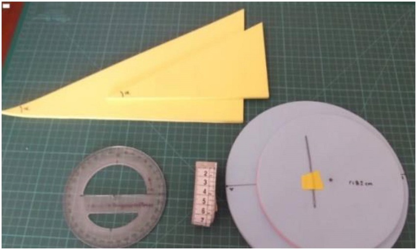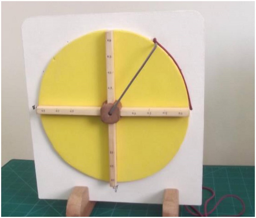 Para este ambiente, construímos, em EVA, um conjunto para cada participante com: três jogos com dois triângulos retângulos semelhantes; discos com raios distintos, cada um acompanhado de um arame com a medida do respectivo raio; um transferidor e uma fita métrica. Com os triângulos (ver Figura 1) foram propostas atividades envolvendo a semelhança entre os triângulos e as relações trigonométricas; com o disco e o arame, as medidas em radianos. Construímos também o dispositivo “ciclo trigonométrico” (ver Figura 2) que o pesquisador utilizou para explicar as características do objeto matemático que leva esse nome.