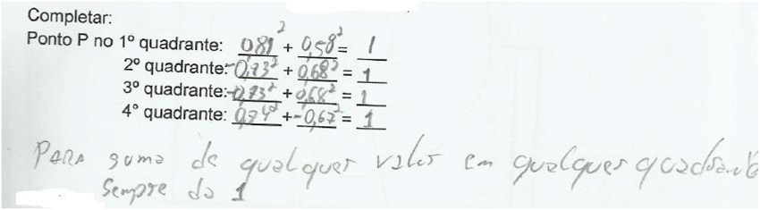 Na Figura 3, exibimos a participação do aluno 3 nessa atividade; verificações semelhantes foram feitas pelos demais participantes presentes, o que mostra que conseguiram observar corretamente a identidade trigonométrica em estudo.