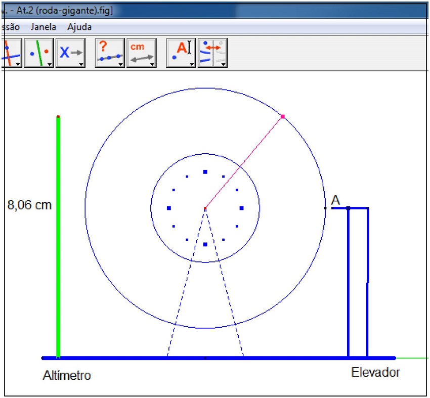Para iniciar a próxima atividade, pedimos que fizessem a leitura de um texto com a definição de uma função periódica e passamos à contextualização da “roda-gigante”. Para esta contextualização, apresentamos o arquivo que contém uma representação da dinâmica do movimento da roda gigante, explicamos como funciona essa dinâmica e pedimos aos participantes que utilizassem o arquivo pronto para determinar os registros do altímetro com o movimento de um ponto da roda (ver Figura 4).