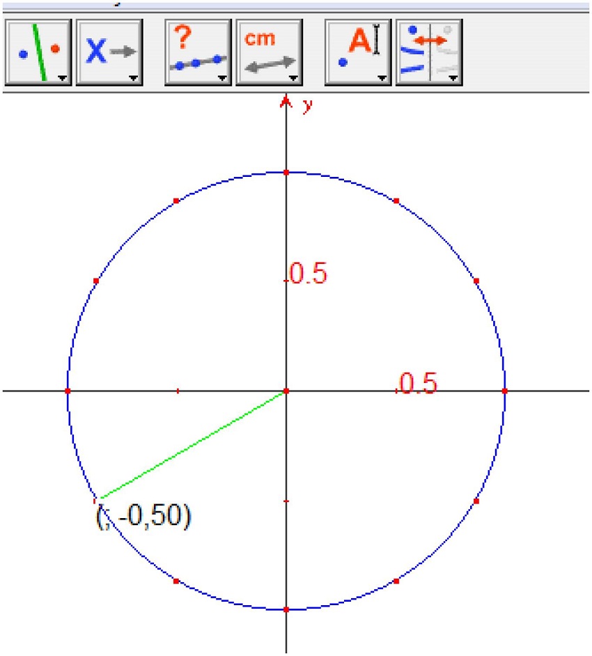 Na terceira intervenção, apresentamos o dispositivo “ciclo trigonométrico” (ver Figura 2), como uma extensão da lousa e do giz. Falamos sobre as medidas em radianos, mostramos o cordão que representa um arco, os eixos cartesianos, materializados pelas réguas cruzadas, o círculo orientado e a primeira determinação de um arco. Nessa ocasião, ouvimos o comentário de um aluno, afirmando que, a partir daquele instante, passava a entender a medida 3,14 rd. Em seguida explicamos, com o Cabri e um projetor de imagens, os passos para a construção de um círculo trigonométrico. Com essa figura, reproduzida no Quadro 2, repetimos as explicações que havíamos feito anteriormente e ativamos a ferramenta “coordenadas”, para um ponto colocado nesse círculo. Com esse ponto na figura dinâmica, os alunos seguiram as instruções da atividade, para calcular a soma dos quadrados dessas coordenadas e puderam perceber a genialidade de Euler, ao criar o círculo trigonométrico para definir a sua funçãoE(x), de um número real x.