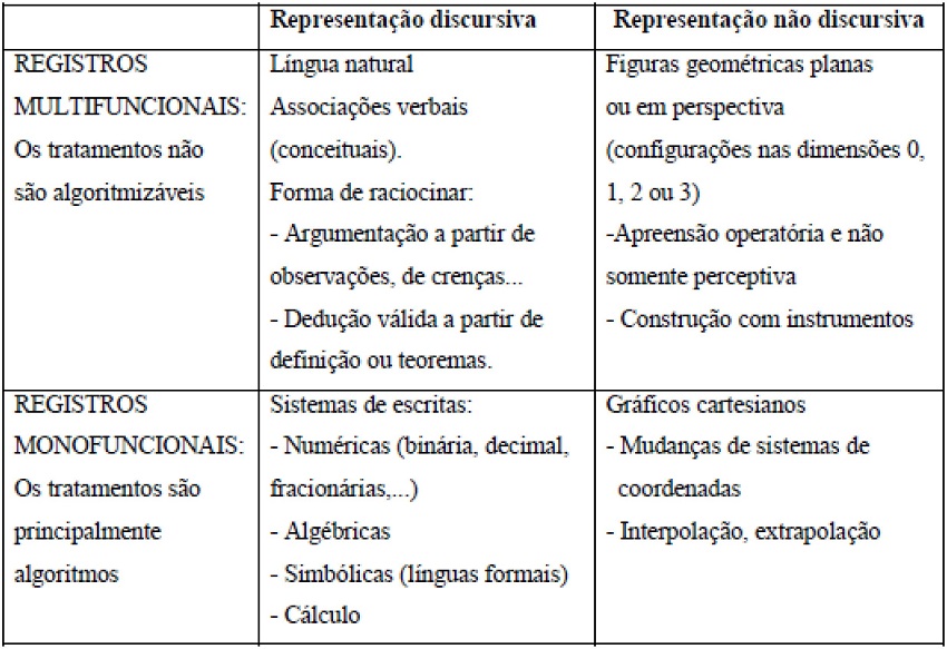 Sob o ponto de vista da aprendizagem e do ensino, na Matemática existem, segundo Duval (2011), dois tipos de transformações radicalmente diferentes: os tratamentos e as conversões. Os tratamentos são as transformações que acontecem dentro de um mesmo sistema de representação; por exemplo, durante um cálculo com números decimais ou na resolução algébrica de um sistema de equações, se permanecemos, respectivamente, nos números decimais ou na escrita algébrica do sistema de equações. As conversões são as transformações de um sistema de representação para outro; por exemplo, durante a passagem da escrita algébrica de uma função para o seu gráfico cartesiano.