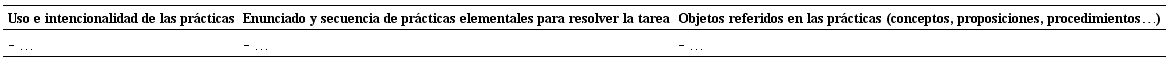 Respecto de la técnica de análisis ontosemiótico, en Godino, Batanero y Roa (2005) se analizan las prácticas matemáticas en la resolución de problemas combinatorios, poniendo el acento en la identificación de los tipos de problemas, los lenguajes, conceptos, procedimientos, proposiciones y argumentos implicados, tanto en la solución por un sujeto epistémico como por estudiantes individuales. Aquí, se puede apreciar una cierta evolución de la técnica de análisis; se propone, ahora, realizar previamente la descomposición en prácticas elementales e identificar la configuración de objetos y procesos, en particular, el de significación, en cada una de las prácticas elementales.