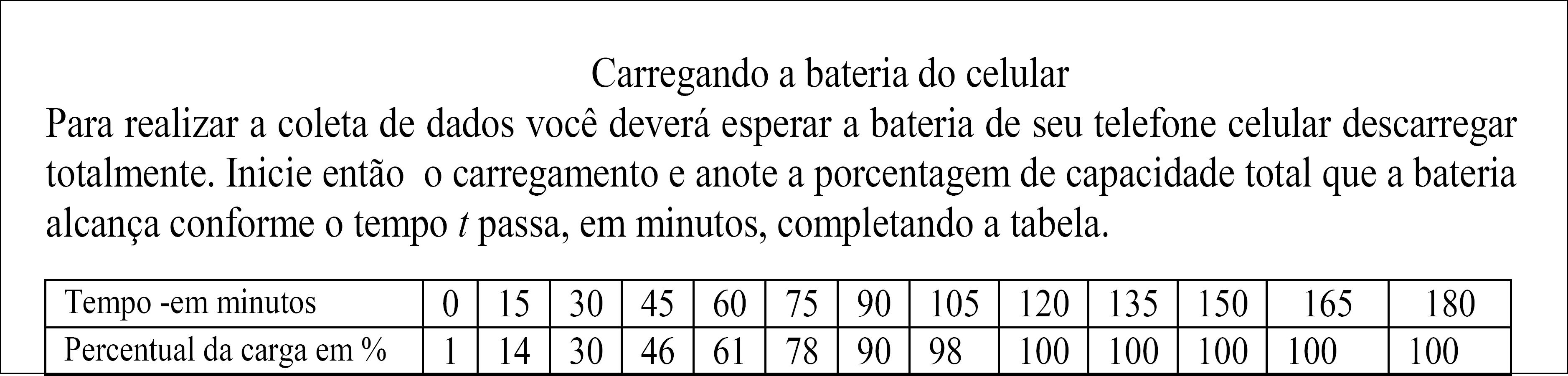 Essa interação entre os participantes do grupo e a professora com foco nos dados coletados traria a temática da atividade para o campo da Matemática, conduzindo à formulação de duas questões a serem respondidas: 1) Em quanto tempo a bateria do telefone celular carrega, aproximadamente, 50%?; 2) Qual é o percentual de carregamento da bateria do telefone celular após 40 minutos de conexão na tomada de energia elétrica?