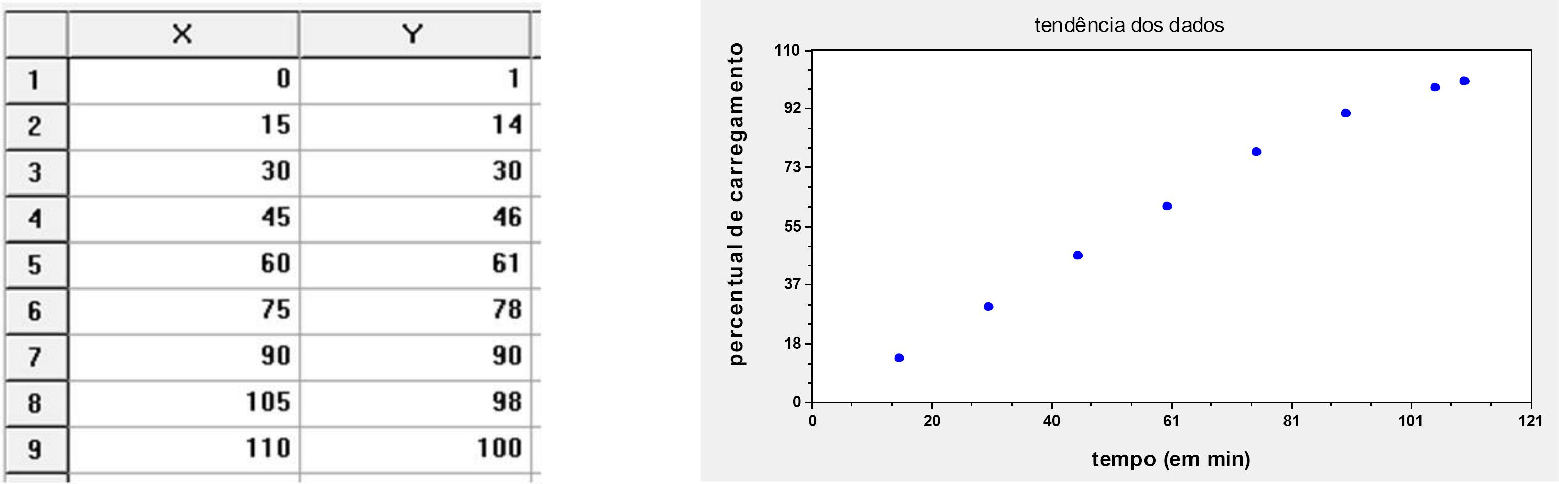 Os investimentos dos alunos direcionaram-se então para a busca de respostas a essas duas questões. No entanto, eles perceberam que para respondê-las seria necessário conhecer a relação entre tempo e percentual de carregamento. Neste instante sentiram a necessidade e a importância da matematização para a interpretação do fenômeno. Essa abordagem matemática, por sua vez, seria mediada pelo uso da tecnologia, mais especificamente por um software já conhecido pelos alunos (Curve Expert 4). As representações geradas com o apoio do software referem-se aos dados coletados e representados sob a forma de tabela e de pontos no plano cartesiano e constam na figura 2.