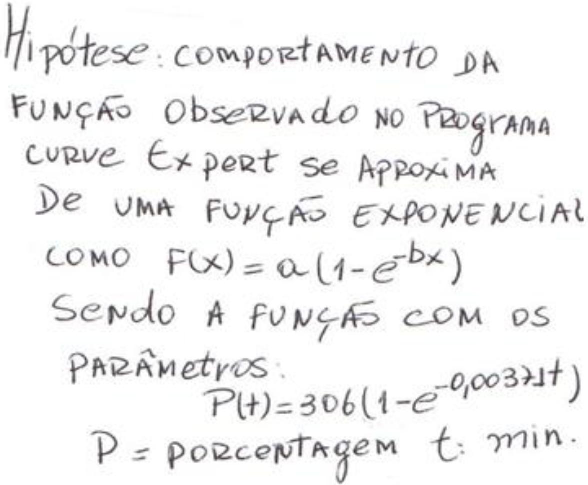 Todavia, na atividade parece ter se configurado um crescimento na semiose e, mais uma vez, experiências colaterais e conhecimentos, tanto matemáticos quanto do fenômeno, gerariam nova semiose. Isto se pode inferir, considerando que os alunos buscaram um “nível de fidelidade” entre modelo e fenômeno e identificaram que, no caso do gráfico da figura 4, Matemática e fenômeno, na verdade, têm especificidades. De fato, a assíntota em P=100% no gráfico é verdadeira para o fenômeno (100% é a bateria cheia!!) todavia, não corresponde ao que a representação algébrica do modelo matemático indica uma vez que e não igual a 100, como indica a figura 4.