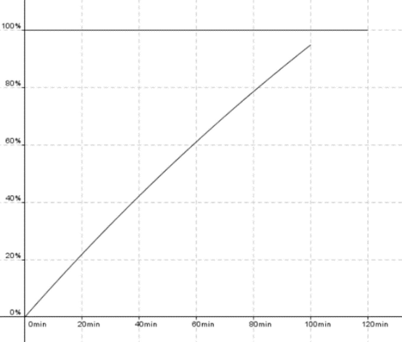 Assim, se o modelo é interpretante final com relação à construção matemática, não é interpretante final do fenômeno. A ação desse interpretante (semiose), sobretudo, viria a buscar ou indicar relações entre Matemática e fenômeno. Além de obter as respostas para as questões e, reconhecendo que a função que descreve o carregamento é crescente, os alunos tinham interesse em analisar como se comporta o crescimento no decorrer dos 110 minutos. Três informações seriam fundamentais para orientar seus pensamentos nesse sentido: em 40 min a bateria carrega 42%; para carregar 50% são necessários 47 min; depois de 110 min a bateria estava completamente carregada.