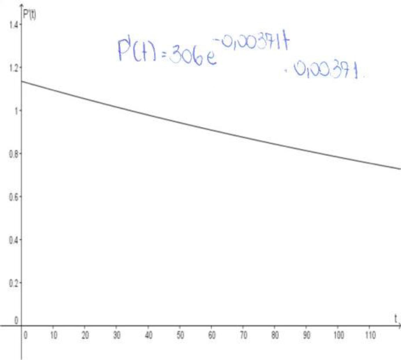 Os alunos puderam observar nesses resultados que a variação do crescimento não é linear no decorrer dos 110 minutos. Isso gerou instabilidade, desconforto cuja superação seria mediada por nova semiose. Assim, novo signo interpretante foi gerado. A função derivada pode ser aqui a necessidade de conhecer mais sobre o que o signo pode gerar no intérprete. A derivada do modelo P(t) = 306 (1−e−0.00371 t), dada por P ′(t) = 1.13526e−0.00371 t, é um interpretante que traz à tona a interpretação de como se comporta o fenômeno. Os alunos determinaram então a derivada de P(t), bem como o gráfico da derivada conforme indica a figura 5.