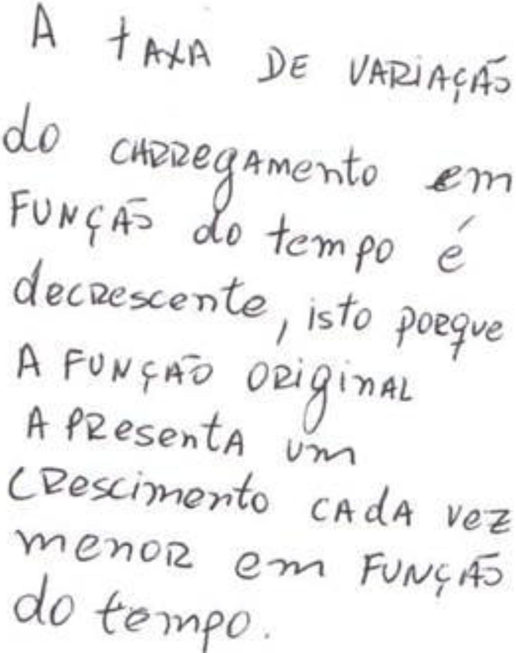 O que os alunos teriam que interpretar é o que significa para a função P(t) o fato de a derivada P ′(t) ser uma função decrescente. Fizeram-no a partir de uma discussão entre os membros do grupo olhando para a função que descreve o carregamento da bateria, analisando seu crescimento em relação ao decrescimento da função derivada. Registraram sua conclusão conforme mostra a figura 6.