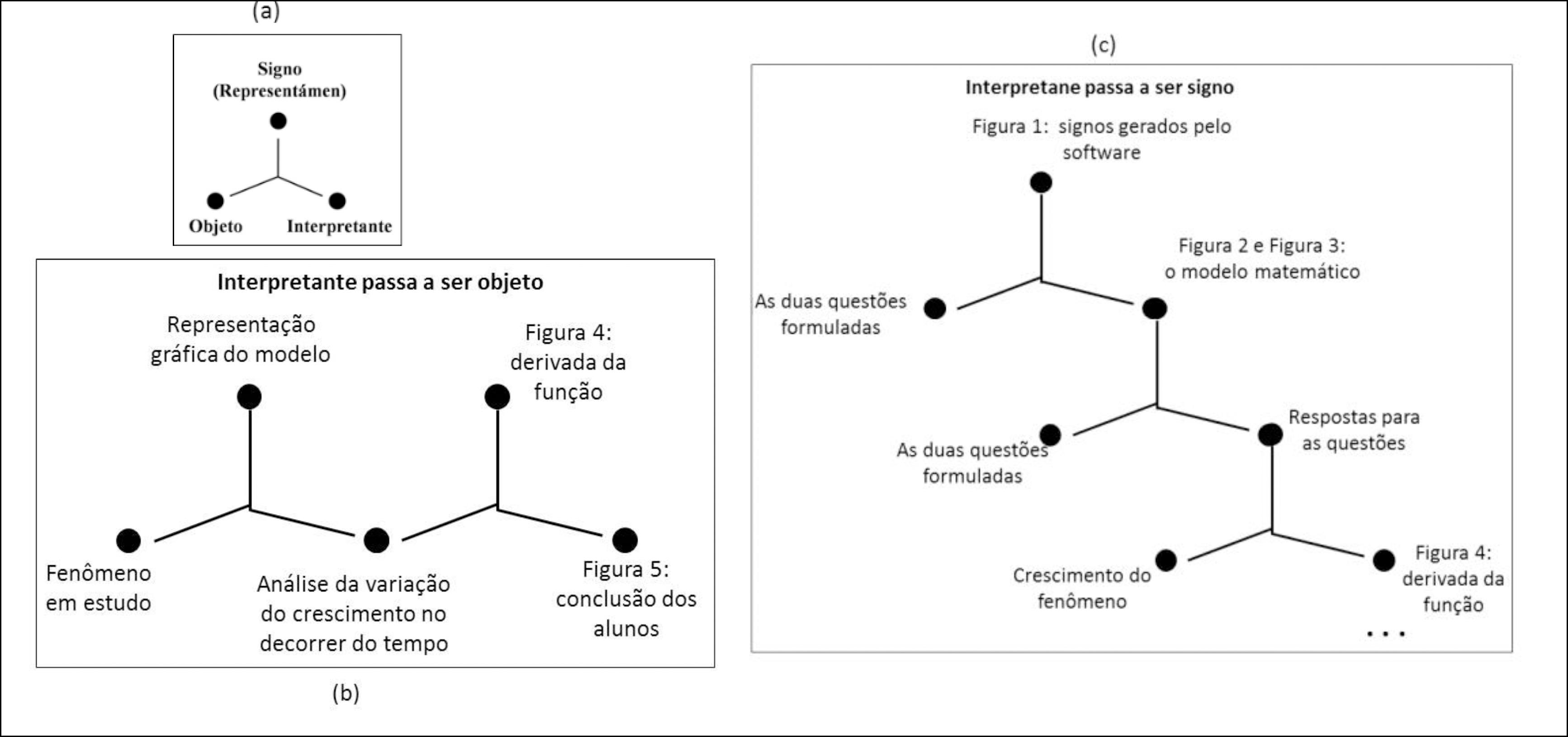 A semiose, caracterizada como ação dos signos, constitui o processo transformador, que envolve signo, objeto e interpretante e, segundo Nöth (2008), ela faz com que o signo tenha um efeito cognitivo sobre o intérprete e gere novos signos. Assim, nos apoiamos em aspectos da semiótica peirceana que nos possibilitam articular os conhecimentos dos alunos viabilizados por meio de signos, matemáticos ou não matemáticos, que produzem ou mobilizam no desenvolvimento de uma atividade de modelagem matemática.