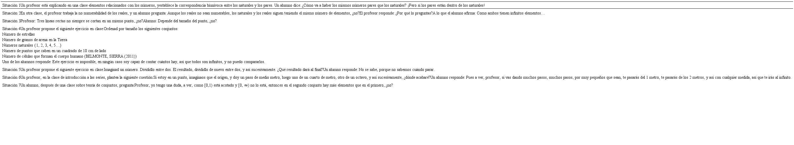 En este artículonos centramos en la discusión de las siete situaciones o viñetas que permitieron profundizar en cada uno de los subdominios de conocimiento especializado de Aarón, a través de la discusión de situaciones en las que hipotéticos alumnos mostraban diferentes formas de aproximarse a la comprensión del infinito. Estas viñetas fueron diseñadas de manera que contemplaran diferentes patrones cognitivos observables en alumnos de secundaria (BELMONTE; SIERRA, 2010). En el Cuadro 1 se presentan las viñetas discutidas: