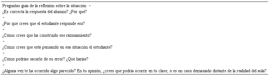 Posteriormente, se pasaba a varias preguntas relacionadas con el estudiante, que nos permitirían explorar el conocimiento del profesor de las características de aprendizaje de sus alumnos (KFLM), buscando posibles justificaciones desde diferentes perspectivas (práctica, matemática, cognitivo-intuitiva) de la respuesta del alumno. Tras esto, se induce al profesor a desplegar su conocimiento de la enseñanza de las matemáticas, en particular de esta situación, para profundizar en cómo abordaría la situación desde las acciones que llevaría a cabo (KMT), lo cual podría generar reflexiones ligadas a materiales manipulativos, estrategias de enseñanza, o dinámicas para conseguir un aprendizaje significativo de la situación. Finalmente, se abre la posibilidad de que el profesor comente experiencias propias, así como de que critique la plausibilidad de esta situación, sirviendo esta crítica como herramienta de triangulación adicional de la viñeta, en términos de su realismo. No se plantearon preguntas ligadas al conocimiento de los estándares de aprendizaje en matemáticas (KMLS), ya que en una de las entrevistas se había profundizado en este tema.