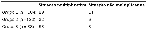 O Teste T não detectou diferenças significativas entre os grupos. Contudo, em cada um deles, o percentual de situações multiplicativas foi significativamente mais alto do que as situações não multiplicativas [Grupo1 (t= 6.786; p < .001); Grupo 2 (t= 11.602; p <.001) e Grupo 3 (t= 10.000 p<.001)], como mostra a Tabela 1.