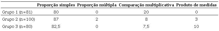 Como ilustrado na Tabela 4, em cada grupo a maioria dos problemas era de proporção simples, enquanto que os demais tipos eram raros, sendo isso estatisticamente confirmado pelo Teste T (Grupo 1: p<.002; Grupo 2: p<.001; e Grupo 3: p<.001).