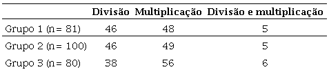 Trinta e nove professores que ensinam Matemática no Ensino Fundamental em escolas públicas da cidade do Recife foram divididos em três grupos3: Grupo 1: 13 professores que lecionam no 1° e 2° ano; Grupo 2: 15 professores que lecionam no 3° e 4° ano; e Grupo 3: 11 professores que lecionam do 5° ao 9° ano. A constituição desses grupos tomou por base a expectativa de que os professores do Grupo 1 lecionavam para crianças que ainda estavam sendo introduzidas às operações de multiplicação e de divisão; os professores do Grupo 2 lecionavam para crianças que, pelo ano de escolaridade frequentado, já dominavam tais operações e os do Grupo 3 lecionavam para alunos que além de dominarem essas operações as utilizavam na resolução de problemas pertencentes ao campo das estruturas multiplicativas como razão, fração, proporção e combinatória, como esperado nesses anos de escolaridade.