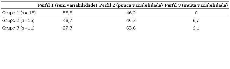De acordo com a Tabela 6, os professores do Grupo 1 e do Grupo 2 se concentram entre o Perfil 1 e o Perfil 2; enquanto que os do Grupo 3 se concentram no Perfil 2. Raros são os entrevistados classificados no Perfil 3 (muita variabilidade).