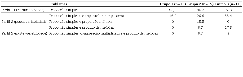 Os professores do Perfil 1 (sem variabilidade) elaboram apenas problemas de proporção simples, sendo isso mais frequente no Grupo 1 (53,8%) e no Grupo 2 (46,7%) do que no Grupo 3 (27,3%). Os professores do Perfil 2 (pouca variabilidade) e do Perfil 3 (muita variabilidade) sistematicamente combinam problemas de proporção simples com problemas de outros tipos. A combinação entre problemas de proporção simples e problemas de comparação multiplicativa foi a mais frequente nos três grupos.