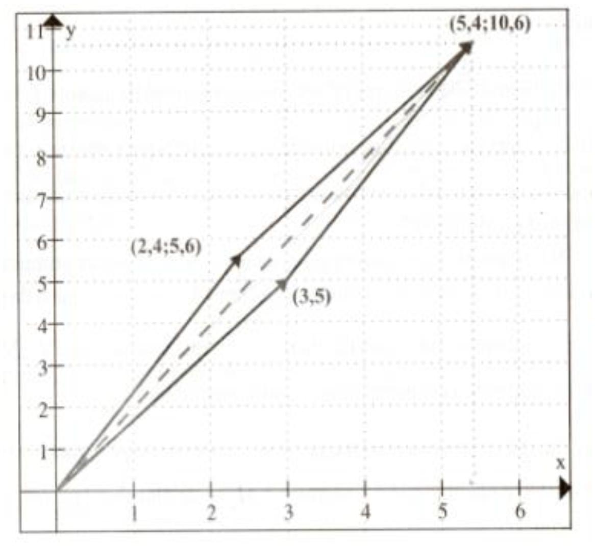 Onuchic e Allevato (2008) alertaram que não se transpusessem as propriedades dos números racionais, como a soma de frações, para a soma de razões, quando realizadas como vetores, por exemplo, e citam . Nesse caso, foi efetuada “[…] a adição das razões, consideradas como os vetores (3;5) e (2,4; 5,6), cuja resultante, obtida pela regra do paralelogramo, é a razão (ou vetor) (5,4; 10,6)” (ONUCHIC; ALLEVATO, 2008, p. 95). O vetor (3;5) refere-se à quantidade de álcool e água misturados em um recipiente de 8 litros, na razão de 3 para 5. O vetor seguinte (2,4; 5,6) diz respeito à mistura de álcool para água, no segundo recipiente também de 8 litros, na razão de 3 para 7. A razão entre álcool e água, na mistura resultante, é dada, então, pela razão ou vetor (5,4;10,6), que pode ser obtida pela tangente do ângulo do vetor (5,4;10,6) com o eixo x e, visualizada no gráfico pela regra do paralelogramo, conforme a Figura 2. Razões podem ser realizadas como vetores binários quando existir uma relação entre as partes que compõem a razão ou o vetor (BOTTA, 1997). Essa afirmação está fundamentada na regra de realização chamada Lei de equivalência, que segundo Botta (1997, p. 82) significa: (x,y) ≡ (u,v) ⇔ (x:y) = (u:v), em que o registro (x,y) ou (u,v) são usados como vetores.