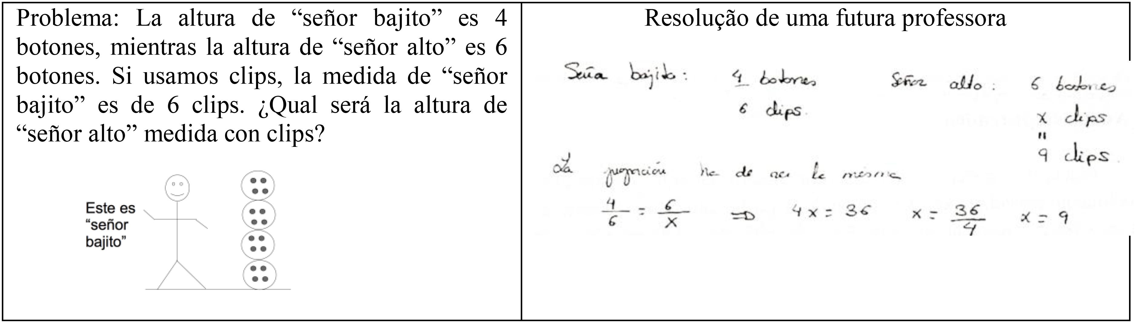 A resolução foi pautada (validada) pela proporção, que significa: “relação de igualdade entre as razões (botões/clips do senhor baixo, botões/clips do senhor alto) que se comparam” (RIVAS; GODINO; CASTRO, 2012, p. 578). Por isso, a estudante escreveu: “A proporção há de ser a mesma 4/6 = 6/x”. A aluna objetivava encontrar o 4° valor, levando-se em consideração a relação proporcional ou a invariância entre as razões. A expressão 4/6 = 6/x pode ser considerada a metarregra que a participante da comunicação utilizou.