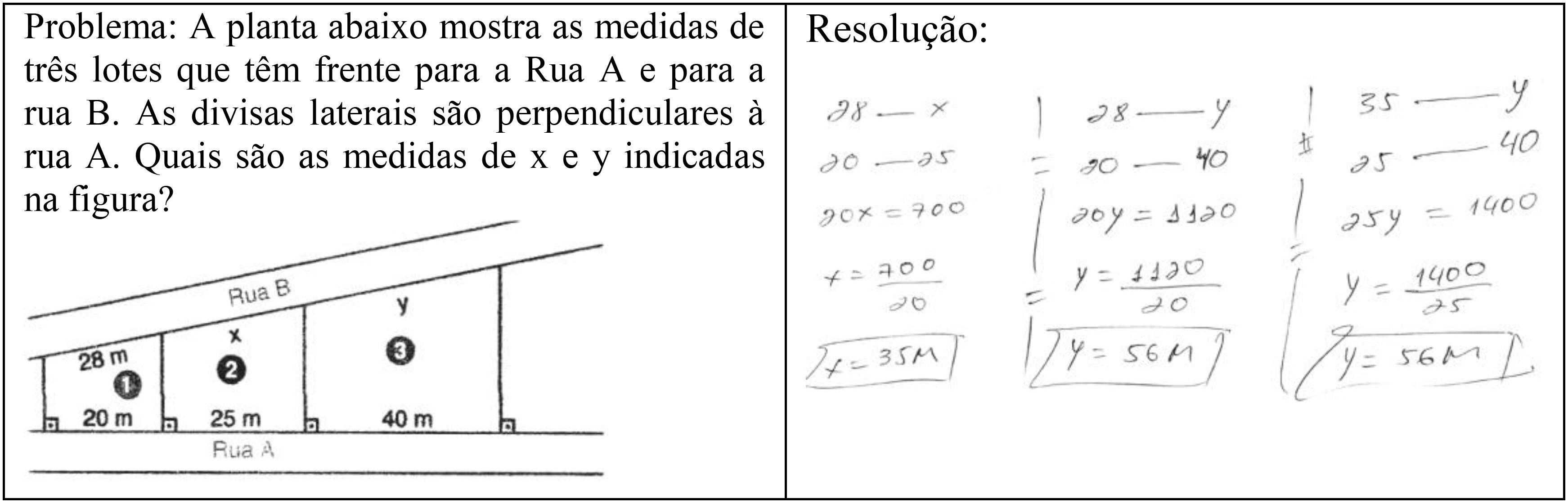 O nome Teorema de Tales surgiu no Brasil na metade do século XX, nos livros-textos referentes ao movimento da matemática moderna (PEREIRA, 2005). Uma das formas de enunciá-lo é: “Se um feixe de retas paralelas é cortado por duas transversais, então as medidas dos segmentos correspondentes que estão sobre a reta são diretamente proporcionais” (PEREIRA, 2005, p. 28). Aplicando o teorema4 à situação descrita na Figura 4, consideraremos as retas transversais como representação das ruas A e B, e as retas paralelas como representação das retas perpendiculares à Rua A, dividindo os lotes. Então, pelo teorema, os segmentos correspondentes que estão sobre a reta (por exemplo, 28 e x; 20 e 25) são diretamente proporcionais. Por isso, a resolução mostrada acima é verdadeira e a regra de três pode ser aplicada, pois foi o que descreveu a estrutura da ação do participante na comunicação, sustentada pelo teorema.