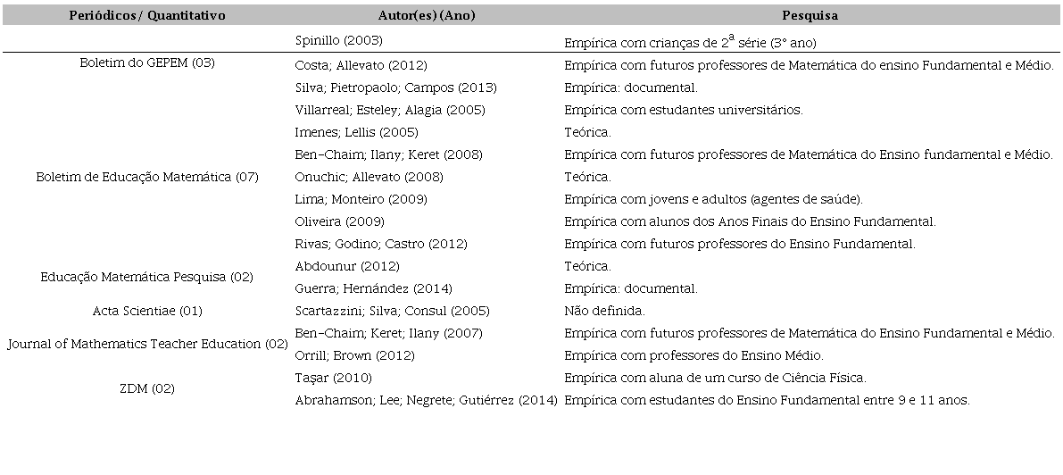 A literatura sobre a qual nos referimos é constituída de periódicos relacionados especificamente com a área de Educação Matemática. Baseamo-nos na classificação Qualis, feita pela Coordenação de Aperfeiçoamento de Pessoal de Nível Superior (CAPES), e o critério que utilizamos para a seleção dos periódicos foi o conceito atribuído entre A1 e B21 nas áreas Educação e Ensino. Dentre esses, selecionamos, arbitrariamente, os seguintes periódicos: Boletim do Grupo de Estudos e Pesquisas em Educação Matemática (Boletim do GEPEM); Zetetiké; Boletim de Educação Matemática (BOLEMA); Educação Matemática Pesquisa; Acta Scientiae, Journal of Mathematics Teacher Education e ZDM - International Journal on Mathematics Education.