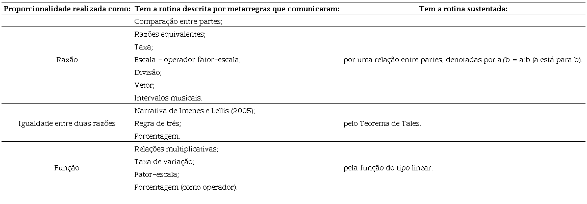 Os resultados das pesquisas, apresentados neste cenário, configuraram a rotina como razão, expressa por a/b ou a:b. A rotina foi estruturada por um conjunto de metarregras que descreveram a relação entre partes de três formas: relação aditiva (soma de vetores), relação comparativa (intervalos musicais) e relação multiplicativa (quando realizada como equivalência de razões, taxa, escala, divisão).