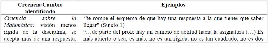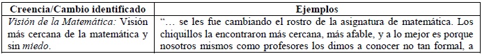 En cuanto a creencias respecto de la matemática, cuatro profesores destacan el cambio de sus alumnos en la forma de ver las matemáticas. Dos profesores señalan que sus alumnos ahora ven la asignatura de manera más cercana, le tienen menos miedo. Otros dos profesores comentaron que sus alumnos pasaron de percibir la matemática como restrictiva y rígida, en la que hay solo un método y una respuesta, a una matemática que permite varios caminos y resultados.