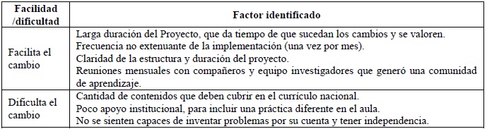 En tercer lugar se resumen los factores que facilitan o dificultan el cambio de los profesores (Cuadro 3).