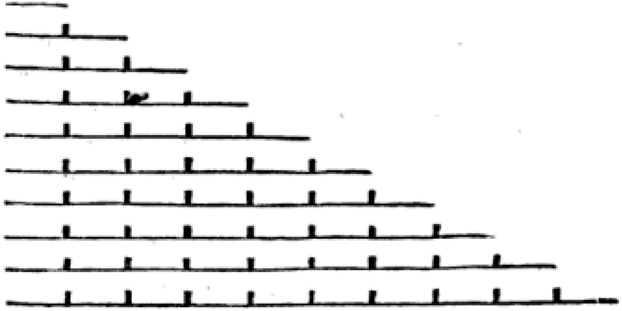 Inicialmente, o propósito da atividade é fazer a criança observar que a primeira linha reta é mais curta do que a segunda; esta também é mais curta que a terceira, e assim sucessivamente. Depois, mostrar que a segunda linha é dividida em duas parte iguais por um ponto; a terceira dividida por dois pontos, e assim sucessivamente. Nota-se que o arranque para o estudo da forma é a linha reta37 . Para Pestalozzi (1826, p. 15), “um dos problemas mais simples será fazer tirar da criança uma linha reta, […]”38. A partir de uma linha reta, a espontaneidade indicaria o ritmo do estudo. Um dos primeiros exercícios é perguntar para a criança o que se faz com uma linha. Ao observar a tábua, ela tem condições de dizer que uma linha reta pode ser prolongada, recuada e dividida.