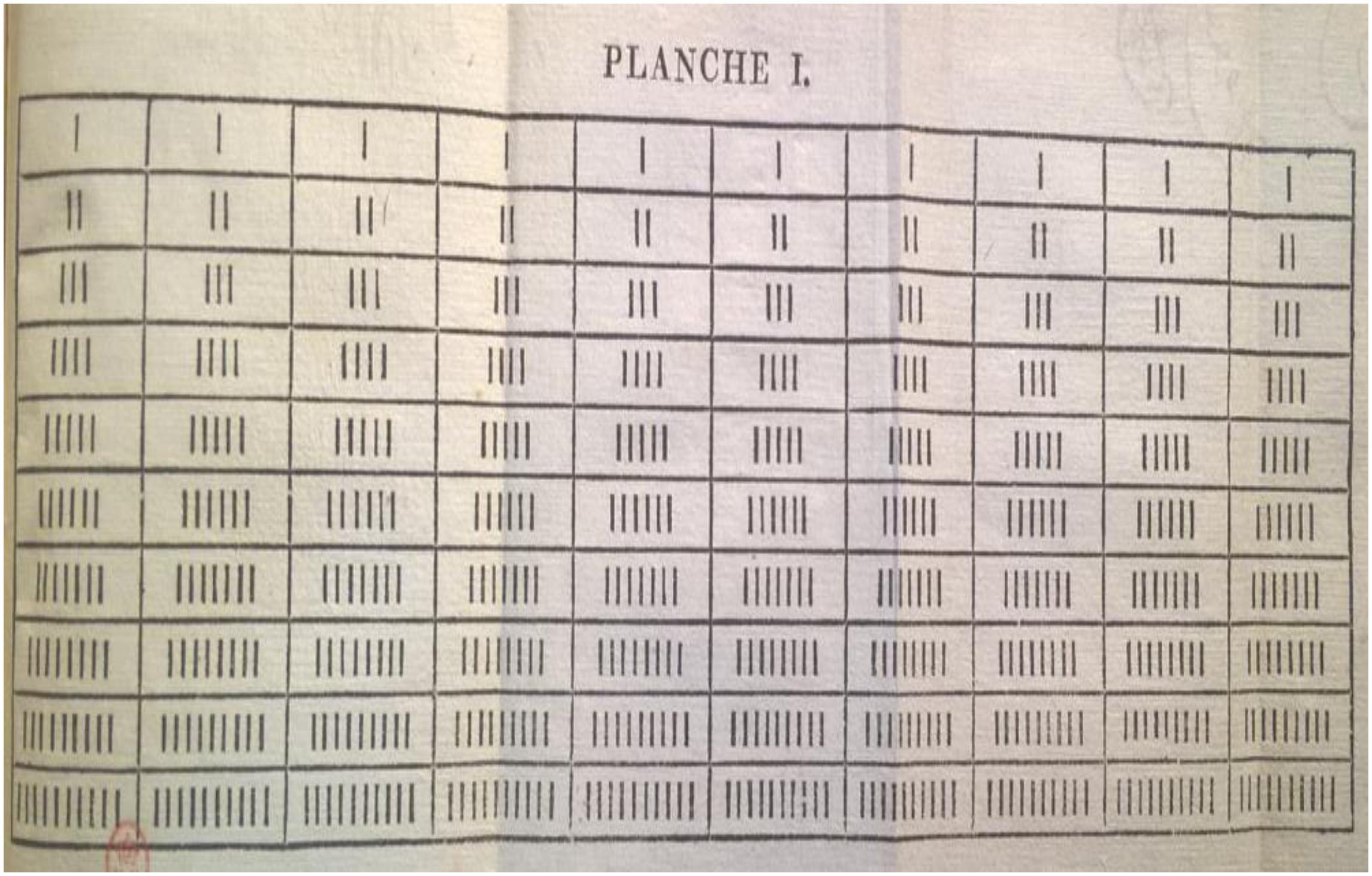 Na direção vertical, passamos a olhar não mas as fileiras, e sim as linhas de cima para baixo que mostra o aumento das unidades a cada linha. Já de baixo para cima, nota-se a diminuição das unidades a cada linha. O uso dessa tábua admitia dois objetivos: 1°) exercitar a capacidade de ver o traço como unidade; 2°) estabelecer as relações entre as unidades. Para o alcance do primeiro objetivo, pedia-se que reproduzisse quatro traços na ardósia e escrevia o algarismo 4; cinco traços e escrevia o algarismo 5, etc. De início, a atividade ia de 1 até 10. Reproduzir traços era também o momento de escrever algarismos. As relações entre os números caracterizam a arte do cálculo. A partir da tábua, o estudo do cálculo combina a intuição exterior com a intuição interior. Fazia-se por exemplo a seguinte questão: “quantas 37 vezes um são vezes 5?”54 (CHAVANNES, 1805, p. 32). Ao observar a tábua, a criança construiria a resposta. Saibamos como: ela iria para a quinta fileira e contaria 7 vezes os quadradinhos com 5 traços que são 35; para formar 37 vezes 1, ela avançaria mais dois traços do quadradinho seguinte. Nessa dinâmica, o professor faria questões envolvendo as operações e os alunos olhando para tábua executavam o cálculo sem a necessidade de escrever os signos (+, –, ×, ÷).