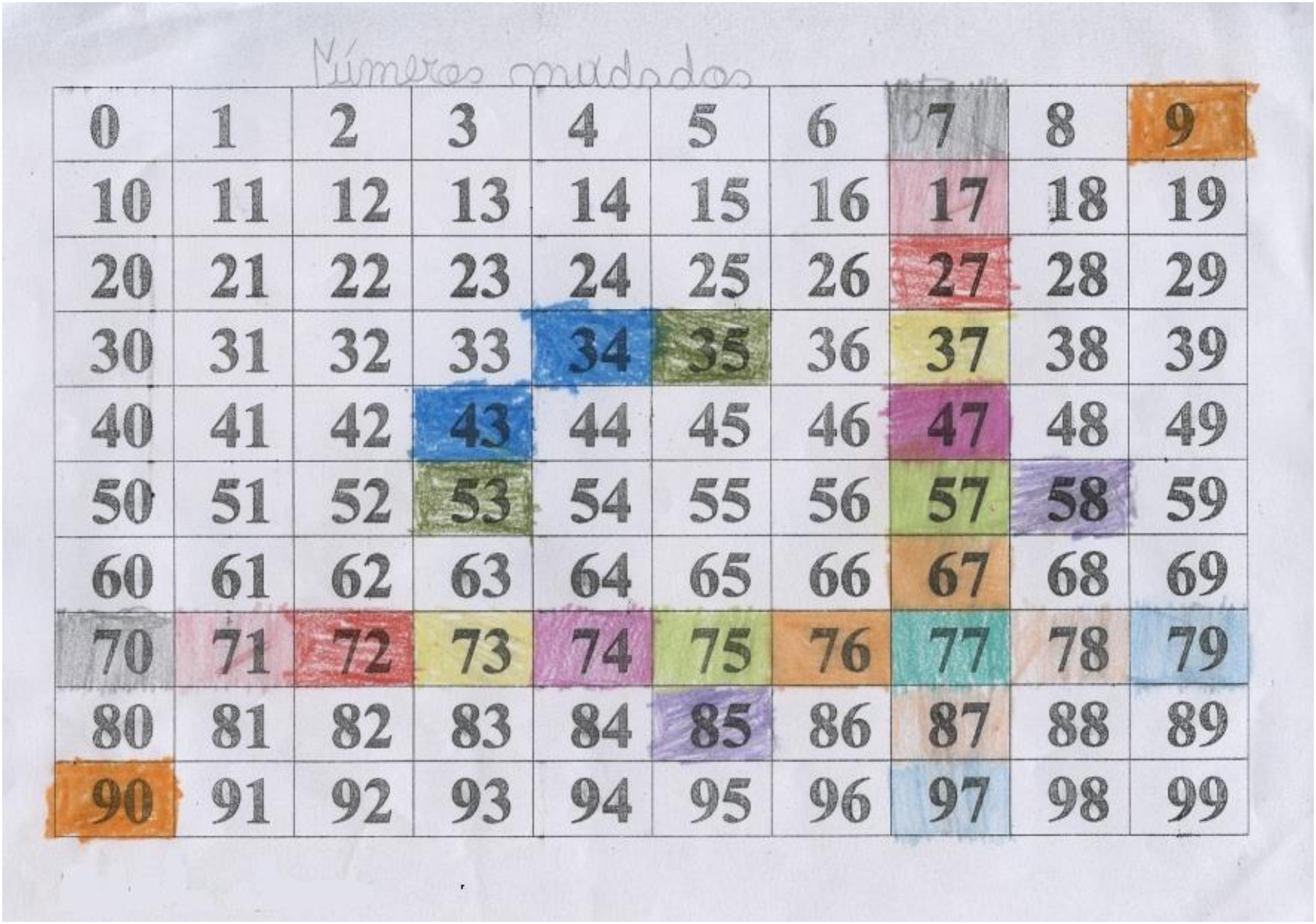 Manoel de BarrosDiante de uma tabela de números organizados em dez linhas e dez colunas, começando do número 0 e seguindo sucessivamente até o número 99, o que acontece? Em meio a números pares, ímpares, primos, quadrados perfeitos, múltiplos de 2, 3, 5, 10, alguns números são coloridos: 27, 72, 34, 43, 28, 82… Quais números são esses? Um sorriso: não sei. Ana5 continua pintando alguns números. Pinta o 27 e o 72 de vermelho, o 34 e 43 de azul, continua pintando. Uns minutos depois: professor, são números mudados. Números mudados? Sim. E como funciona? O que está aqui (aponta para o algarismo da unidade) agora está aqui (aponta para o algarismo da dezena do outro número). Assim, o algarismo que estava na unidade, passa a compor o outro número, situando-se na dezena e, do mesmo modo, o que estava na dezena, agora está na unidade. Ana continua pintando e, assim, inventando os números mudados.