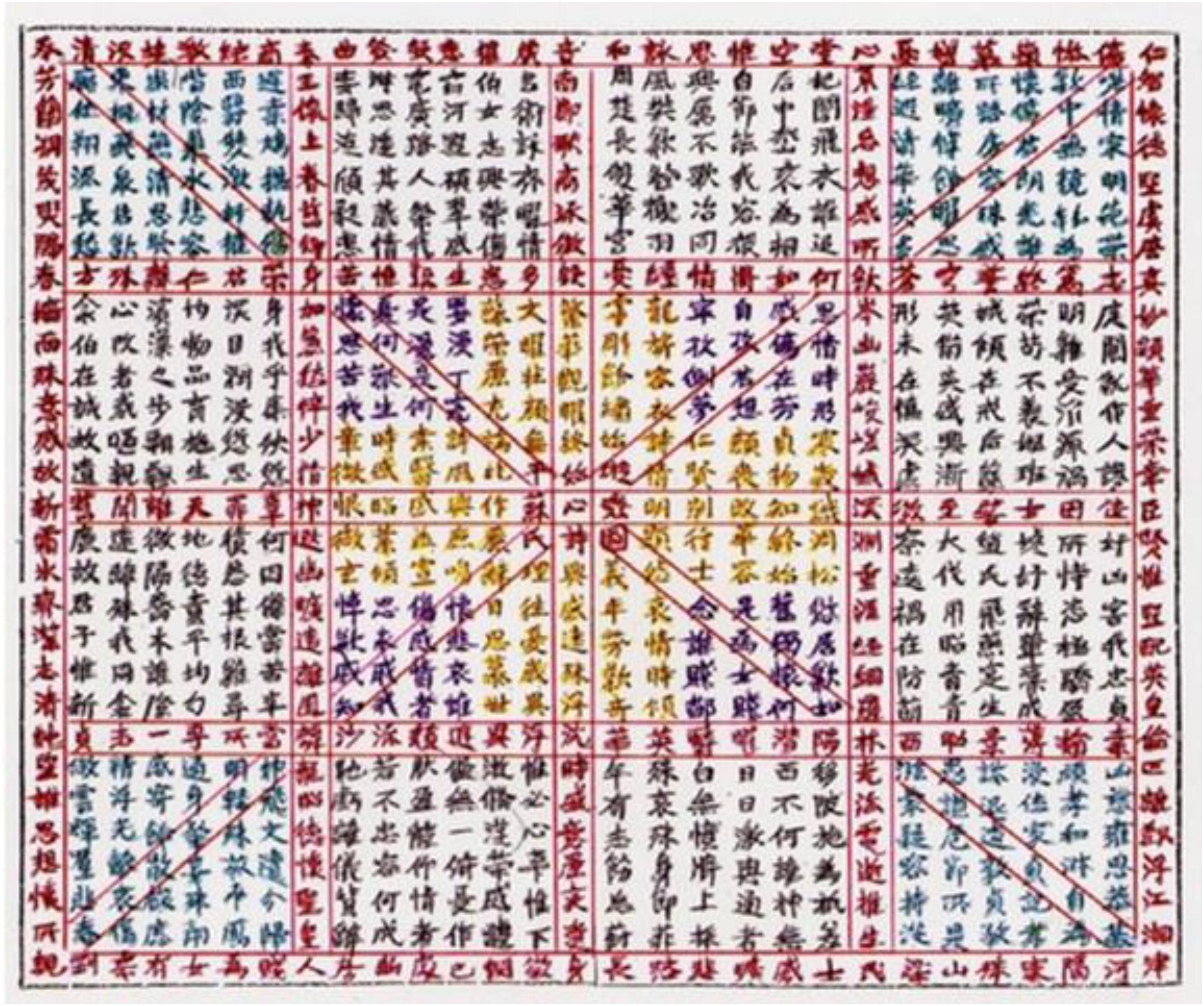 A figura acima retrata um poema feito por Su Hui no século IV. O poema é um enigma que só faz sentido lendo-se a partir da palavra “marido” na primeira linha e continuando pela diagonal descendente para a direita. Depois o leitor desce um caractere para a direita e sobe pela diagonal esquerda. Depois de tentar decifrar o poema, um homem do século XVIII alegou haver descoberto mais de nove mil poemas.