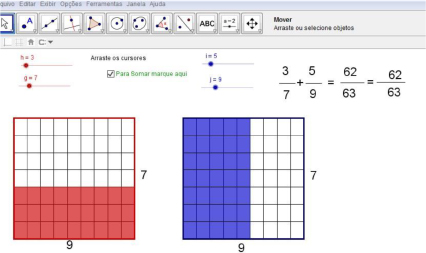 Assim, ao analisarem a atividade e perceberem que a abordagem não satisfazia o que eles precisavam trabalhar com os alunos em relação a esse conteúdo, os professores começaram a explorar as funcionalidades do software para tentar fazer as alterações que consideravam necessárias. Ou seja, eles estavam explorando e aprendendo uns com os outros sobre tais funcionalidades, em particular acerca da programação realizada para o cálculo da adição, que utilizou a funcionalidade sequência10 e outras desconhecidas pela maioria deles, constituindo assim um ambiente colaborativo de aprendizagem, em sintonia com as características pontuadas por Santos e Trocado (2016). Desse modo, eles refletiram acerca de possibilidades de aprendizagem em sala de aula, levando em consideração os conceitos que deveriam ser trabalhados em relação ao conteúdo de adição de frações próprias, e assim, passaram a explorar o GeoGebra para tentar fazer as alterações necessárias, e consequentemente criar um novo material, assim como defendem Rosa, Pazuch e Vanini (2012).