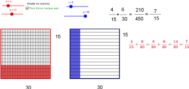 Outra atividade que também foi realizada ao longo dessas duas ações abordou a adição de frações próprias, constituída por uma construção pronta extraída do GeoGebra tube9, em que, por meio da variação dos controles deslizantes, era possível alterar os numeradores e denominadores das frações e a soma delas. Então o intuito era que os professores avaliassem se a abordagem era apropriada para que seus alunos compreendessem e visualizassem geometricamente essa soma, conforme mostra a Figura 2.
