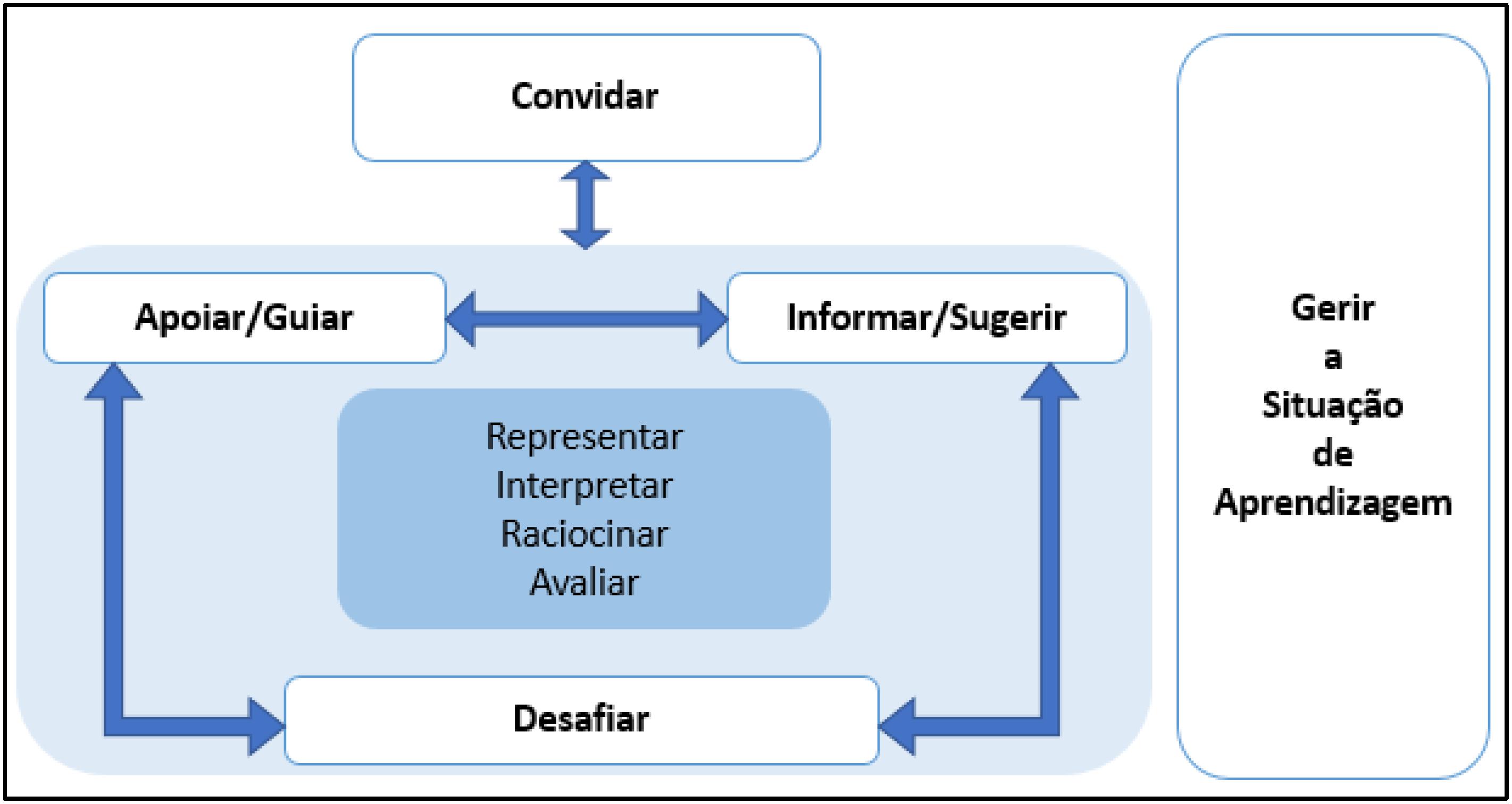 Este modelo destaca ações relacionadas com processos matemáticos, nomeadamente, ações de convidar, informar/sugerir, apoiar/guiar e desafiar. As ações de convidar são, geralmente, as que dão início à discussão coletiva ou a um segmento desta discussão, quando o professor incentiva os alunos a participar e a partilhar as suas resoluções. No decorrer da discussão o professor recorre essencialmente aos outros três tipos de ações, que visam diretamente a aprendizagem por parte dos alunos. Nas ações de informar/sugerir o professor disponibiliza informação aos alunos ou valida as suas afirmações, enquanto nas ações de apoiar/guiar conduz os alunos a apresentar informação. Já nas ações de desafiar, incentiva os alunos a ir além do seu conhecimento prévio. Nestes três tipos de ações centrais na discussão, os autores consideram ainda diversos processos matemáticos envolvidos, não necessariamente disjuntos: representar, interpretar, raciocinar e avaliar. Atendendo ao nosso objetivo, na análise com este modelo focamo-nos, essencialmente, nas ações do professor relacionadas com processos de raciocínio.